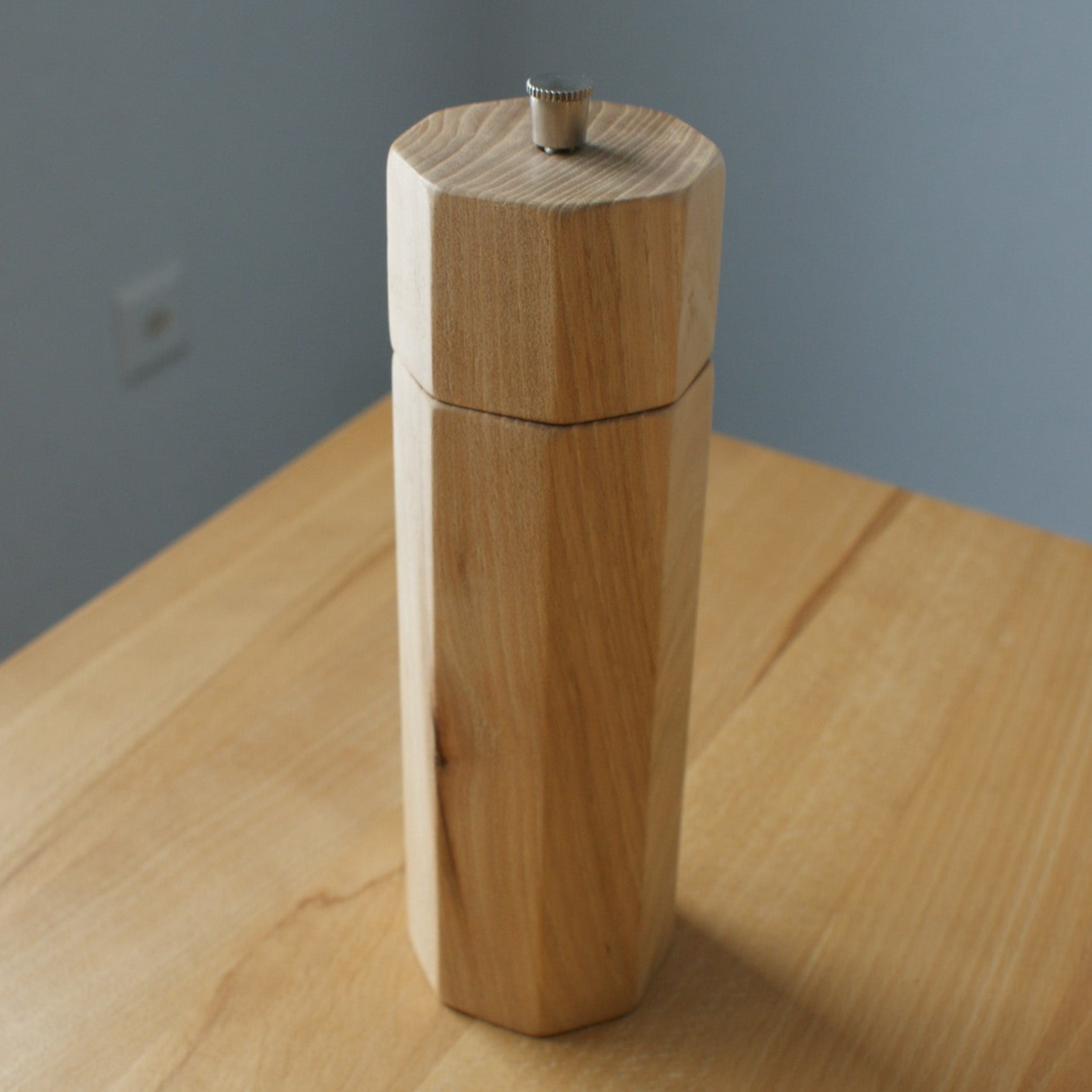 Pfeffermühle aus Ulmenholz mit einem schweiss- und speichelechten Schutzlack versehen.